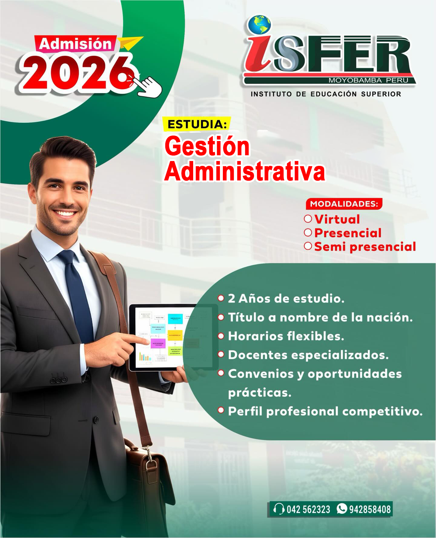 El egresado del programa de Gestión Administrativa del Instituto ISFER es un profesional técnico competente para gestionar procesos administrativos en organizaciones públicas y privadas. Posee capacidades para planificar, organizar y controlar actividades empresariales, gestionar recursos humanos, financieros y logísticos, elaborar documentación administrativa y utilizar herramientas tecnológicas para la toma de decisiones. Se caracteriza por actuar con ética profesional, responsabilidad, liderazgo y compromiso con la mejora continua.